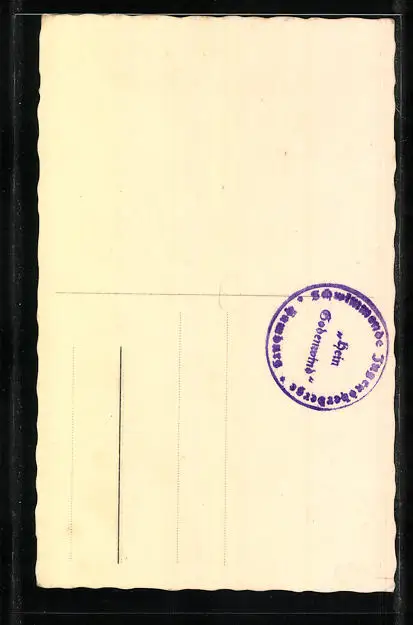 Personenbezogene Daten auf der Rückseite der Karte wurden durch blauen Textmarker unkenntlich gemacht. Die blauen Stellen sind auf die Vorderseite durchgeweicht und wirken sich negativ auf das Postkartenfoto aus