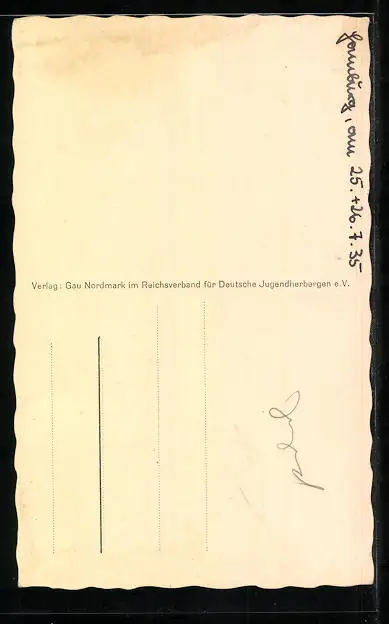 Personenbezogene Daten auf der Rückseite der Karte wurden durch blauen Textmarker unkenntlich gemacht. Die blauen Stellen sind auf die Vorderseite durchgeweicht und wirken sich negativ auf das Postkartenfoto aus
