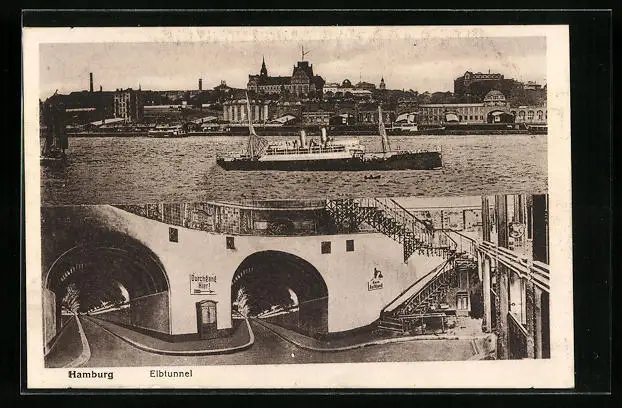 AK Hamburg-St. Pauli, Elbtunnel, Ansicht mit Elbe und Dampfschiff