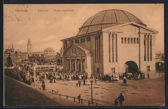 AK Hamburg-St. Pauli, Elbtunnel, Eingangs-Gebäude mit Passanten