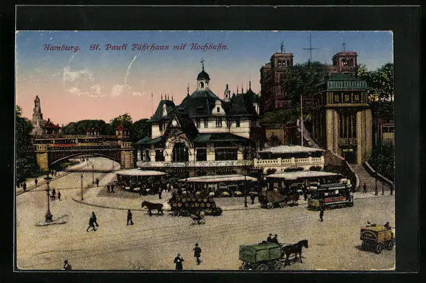 AK Hamburg-St. Pauli, Fährhaus mit Hochbahn und Strassenbahn
