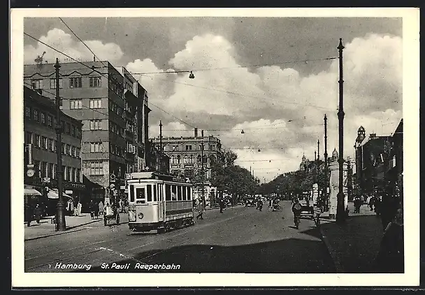 AK Hamburg-St. Pauli, Strasse Reeperbahn mit Geschäften und Strassenbahn