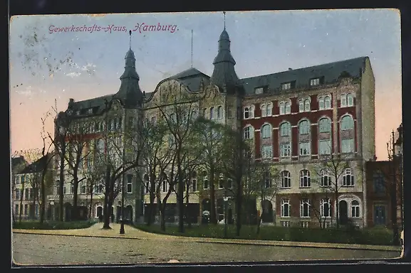 AK Hamburg-St.Georg, Gewerkschaftshaus mit Strassenpartie
