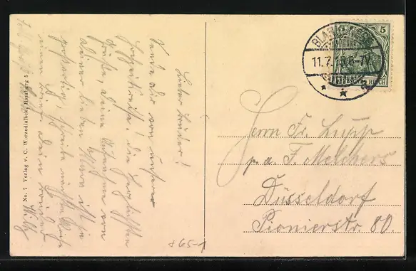 Personenbezogene Daten auf der Rückseite der Karte wurden durch blauen Textmarker unkenntlich gemacht. Die blauen Stellen sind auf die Vorderseite durchgeweicht und wirken sich negativ auf das Postkartenfoto aus