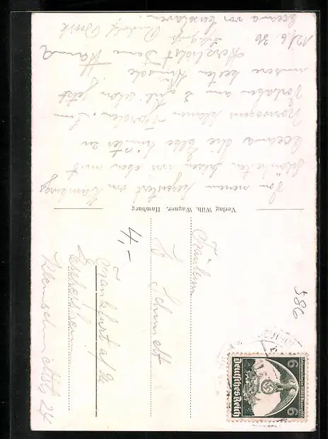Personenbezogene Daten auf der Rückseite der Karte wurden durch blauen Textmarker unkenntlich gemacht. Die blauen Stellen sind auf die Vorderseite durchgeweicht und wirken sich negativ auf das Postkartenfoto aus