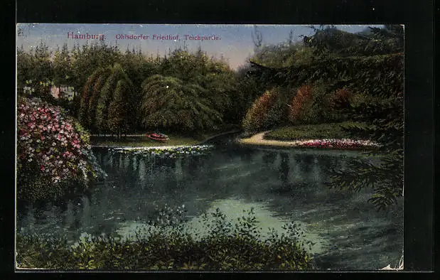 AK Hamburg, Teichpartie im Ohlsdorfer Friedhof