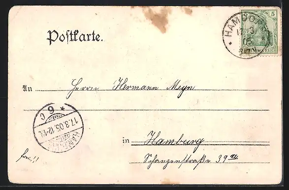 alte Ansichtskarte, gelaufen 1905, Eckknicke li. und oben re., guter Zustand