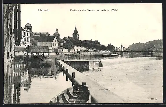 AK Hameln, Partie an der Weser mit unterm Wehr