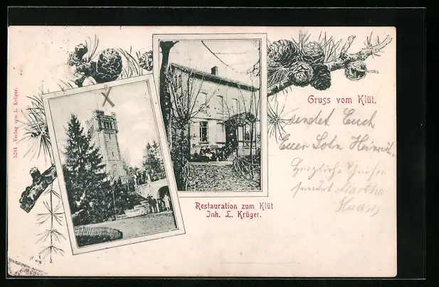 Personenbezogene Daten auf der Rückseite der Karte wurden durch blauen Textmarker unkenntlich gemacht. Die blauen Stellen sind auf die Vorderseite durchgeweicht und wirken sich negativ auf das Postkartenfoto aus