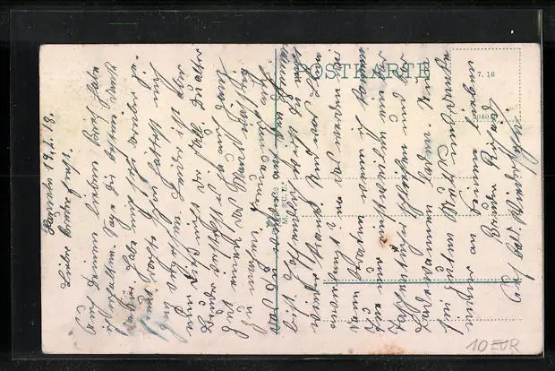 Personenbezogene Daten auf der Rückseite der Karte wurden durch blauen Textmarker unkenntlich gemacht. Die blauen Stellen sind auf die Vorderseite durchgeweicht und wirken sich negativ auf das Postkartenfoto aus