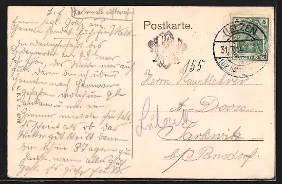 Personenbezogene Daten auf der Rückseite der Karte wurden durch blauen Textmarker unkenntlich gemacht. Die blauen Stellen sind auf die Vorderseite durchgeweicht und wirken sich negativ auf das Postkartenfoto aus