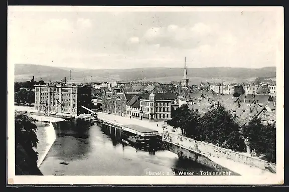 AK Hameln a. d. Weser, Totalansicht mit Fluss