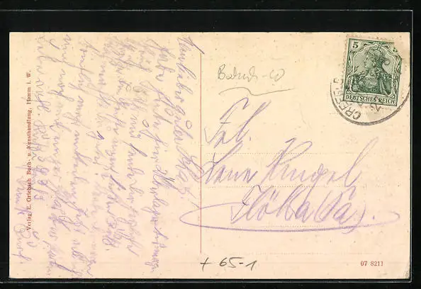 Personenbezogene Daten auf der Rückseite der Karte wurden durch blauen Textmarker unkenntlich gemacht. Die blauen Stellen sind auf die Vorderseite durchgeweicht und wirken sich negativ auf das Postkartenfoto aus