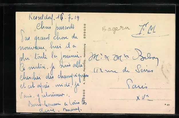 Personenbezogene Daten auf der Rückseite der Karte wurden durch blauen Textmarker unkenntlich gemacht. Die blauen Stellen sind auf die Vorderseite durchgeweicht und wirken sich negativ auf das Postkartenfoto aus