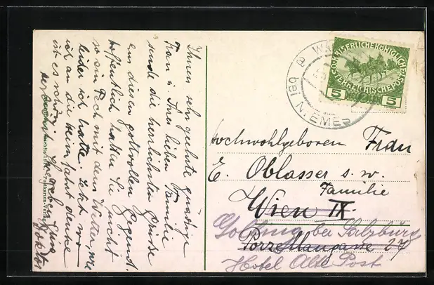 Personenbezogene Daten auf der Rückseite der Karte wurden durch blauen Textmarker unkenntlich gemacht. Die blauen Stellen sind auf die Vorderseite durchgeweicht und wirken sich negativ auf das Postkartenfoto aus
