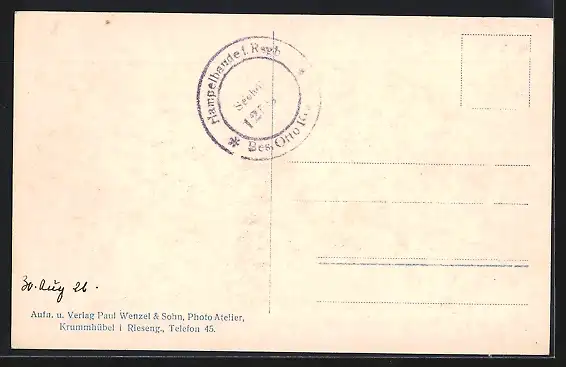 Personenbezogene Daten auf der Rückseite der Karte wurden durch blauen Textmarker unkenntlich gemacht. Die blauen Stellen sind auf die Vorderseite durchgeweicht und wirken sich negativ auf das Postkartenfoto aus
