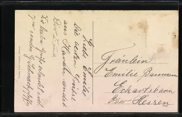 Personenbezogene Daten auf der Rückseite der Karte wurden durch blauen Textmarker unkenntlich gemacht. Die blauen Stellen sind auf die Vorderseite durchgeweicht und wirken sich negativ auf das Postkartenfoto aus