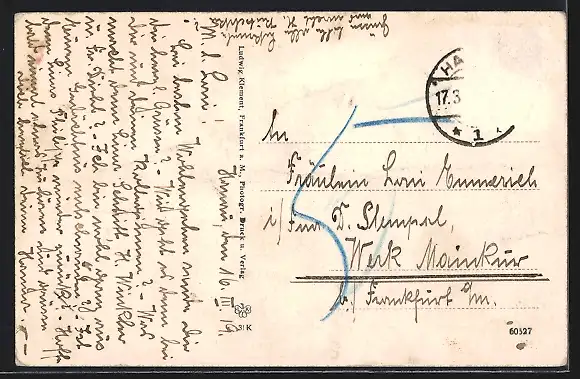 Personenbezogene Daten auf der Rückseite der Karte wurden durch blauen Textmarker unkenntlich gemacht. Die blauen Stellen sind auf die Vorderseite durchgeweicht und wirken sich negativ auf das Postkartenfoto aus
