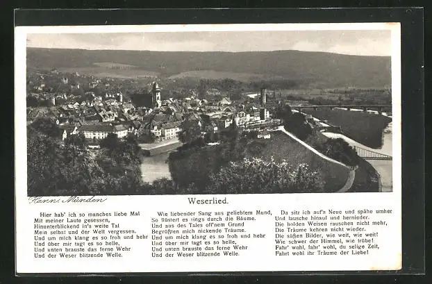 AK Hann. Münden, Stadtpanorama und Weserlied in Textform