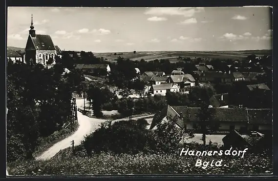 AK Hannersdorf, Ortsansicht mit Kirche aus der Vogelschau