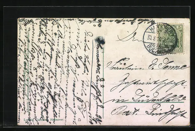 Personenbezogene Daten auf der Rückseite der Karte wurden durch blauen Textmarker unkenntlich gemacht. Die blauen Stellen sind auf die Vorderseite durchgeweicht und wirken sich negativ auf das Postkartenfoto aus