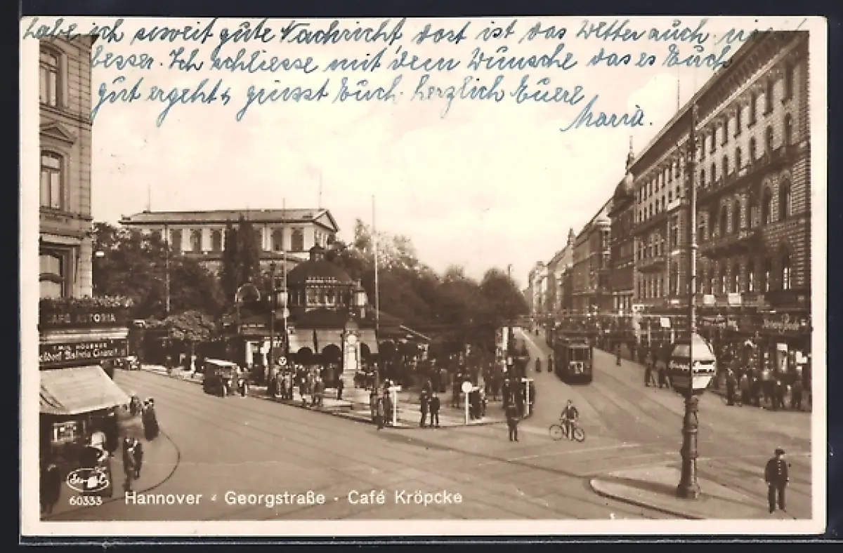 AK Hannover, Georgstrasse, Cafe Kröpcke u. Strassenbahn