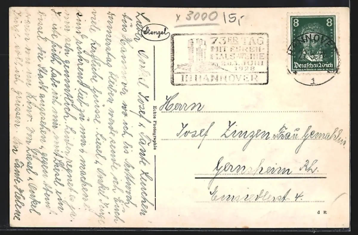 Personenbezogene Daten auf der Rückseite der Karte wurden durch blauen Textmarker unkenntlich gemacht. Die blauen Stellen sind auf die Vorderseite durchgeweicht und wirken sich negativ auf das Postkartenfoto aus