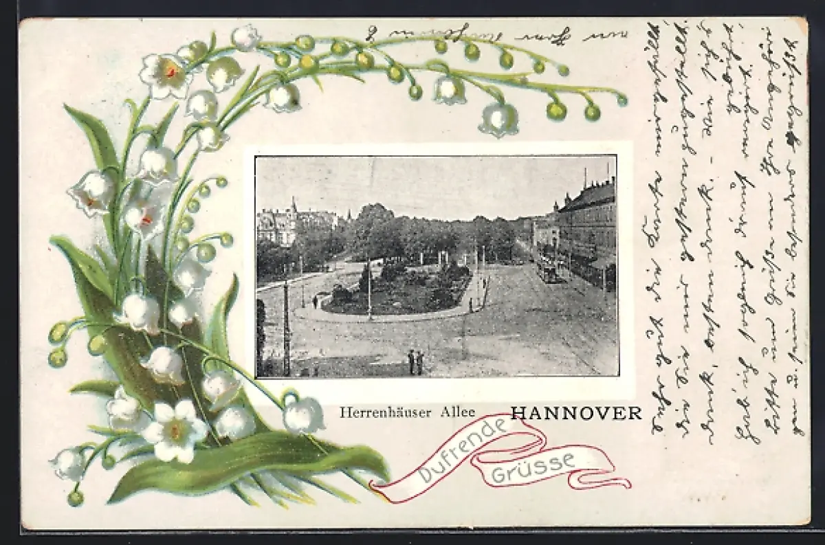 AK Hannover, Herrenhäuser Allee aus der Vogelschau, Maiglöckchen