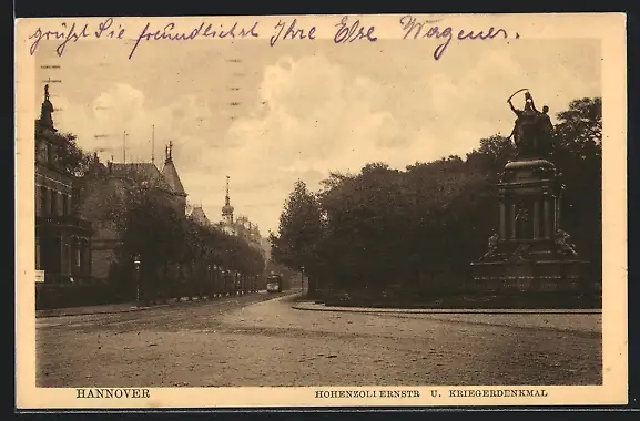AK Hannover, Hohenzollernstrasse mit Strassenbahn und Kriegerdenkmal