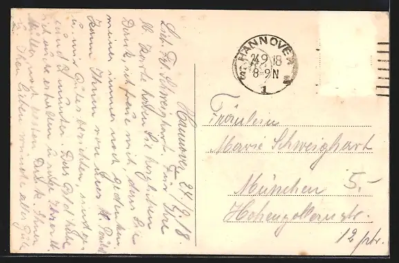 alte Ansichtskarte, gelaufen 1918, Briefmarke entfernt, rückseitig Oberflächenschaden, guter Zustand