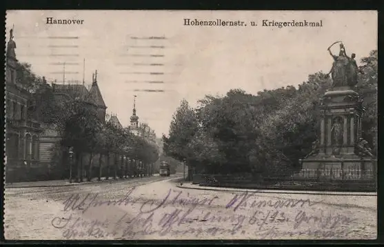 AK Hannover, Hohenzollernstrasse und Kriegerdenkmal, Strassenbahn