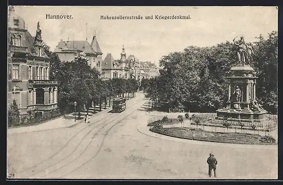 AK Hannover, Hohenzollernstrasse und Kriegerdenkmal, Strassenbahn