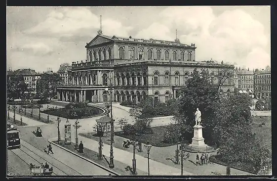 AK Hannover, Kgl. Hoftheater, Denkmal und Strassenbahn