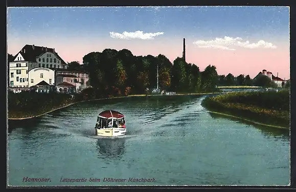 AK Hannover, Leinepartie beim Döhrener Maschpark mit Boot