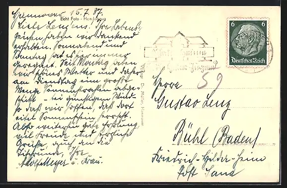 gelaufen 1937, Eckknick li. unten, guter Zustand
