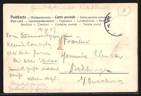 alte Ansichtskarte, gelaufen, Briefmarke entfernt, rückseitig Oberflächenschaden, guter Zustand