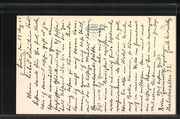 Personenbezogene Daten auf der Rückseite der Karte wurden durch blauen Textmarker unkenntlich gemacht. Die blauen Stellen sind auf die Vorderseite durchgeweicht und wirken sich negativ auf das Postkartenfoto aus