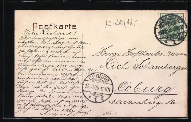 alte Ansichtskarte, gelaufen 1905, Abriebspur oben re., guter Zustand