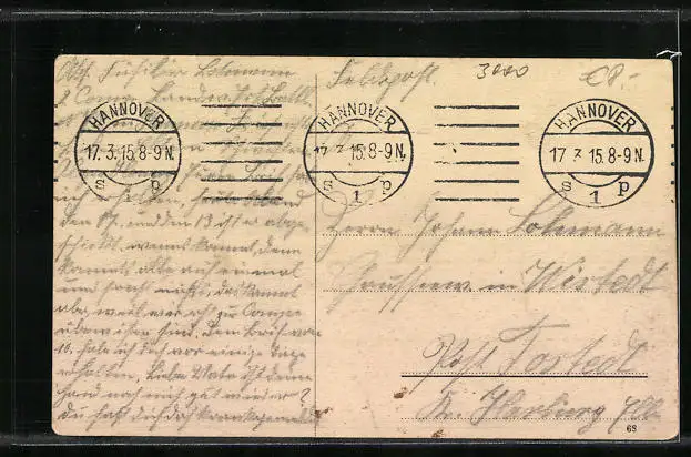 Personenbezogene Daten auf der Rückseite der Karte wurden durch blauen Textmarker unkenntlich gemacht. Die blauen Stellen sind auf die Vorderseite durchgeweicht und wirken sich negativ auf das Postkartenfoto aus