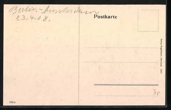 Personenbezogene Daten auf der Rückseite der Karte wurden durch blauen Textmarker unkenntlich gemacht. Die blauen Stellen sind auf die Vorderseite durchgeweicht und wirken sich negativ auf das Postkartenfoto aus