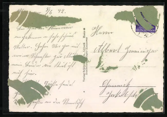 alte Ansichtskarte, gelaufen, rückseitig Klebe- und Papierreste, guter Zustand
