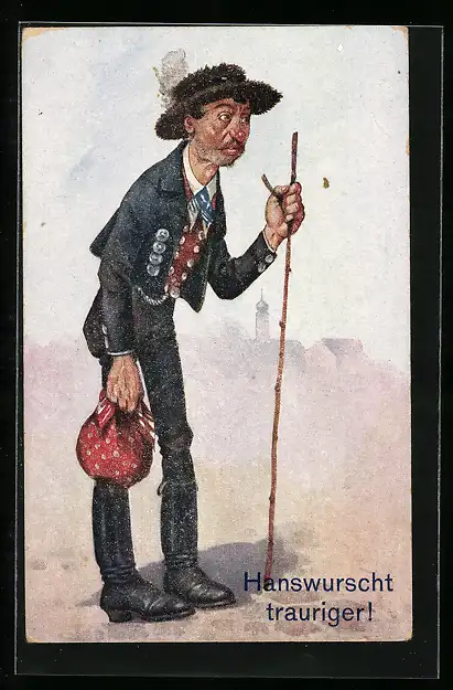 AK Hanswurscht trauriger!, verarmter Mann mit kleinem Beutel und Wanderstock