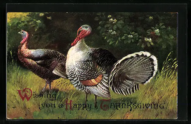 AK Happy Thanksgiving, Truthahn und Truthenne auf einerm Wiese