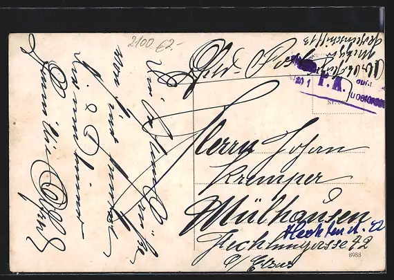 Personenbezogene Daten auf der Rückseite der Karte wurden durch blauen Textmarker unkenntlich gemacht. Die blauen Stellen sind auf die Vorderseite durchgeweicht und wirken sich negativ auf das Postkartenfoto aus