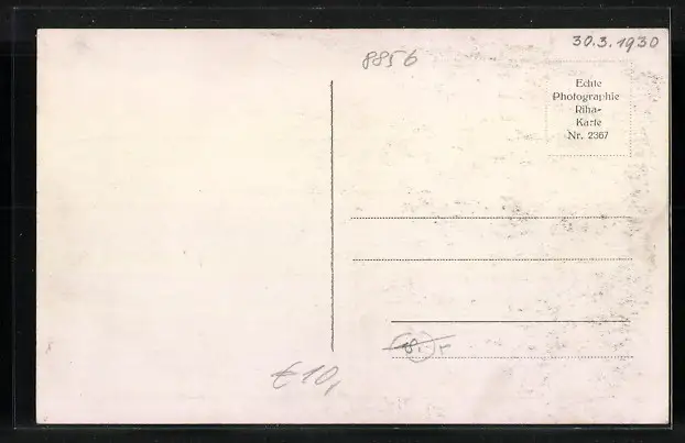 Personenbezogene Daten auf der Rückseite der Karte wurden durch blauen Textmarker unkenntlich gemacht. Die blauen Stellen sind auf die Vorderseite durchgeweicht und wirken sich negativ auf das Postkartenfoto aus