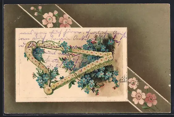 AK Harfe mit Vergissmeinnicht-Schmuck