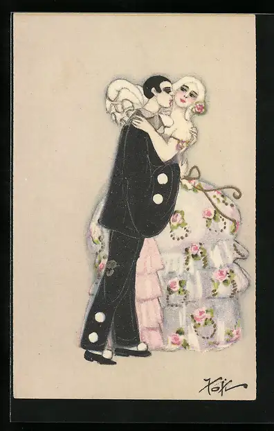 AK Harlekin küsst seine Geliebte