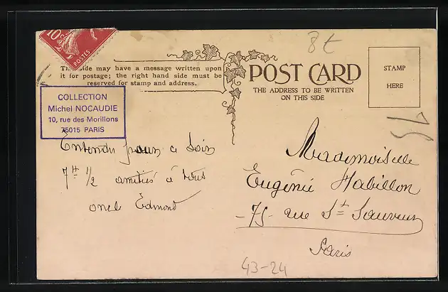 Personenbezogene Daten auf der Rückseite der Karte wurden durch blauen Textmarker unkenntlich gemacht. Die blauen Stellen sind auf die Vorderseite durchgeweicht und wirken sich negativ auf das Postkartenfoto aus