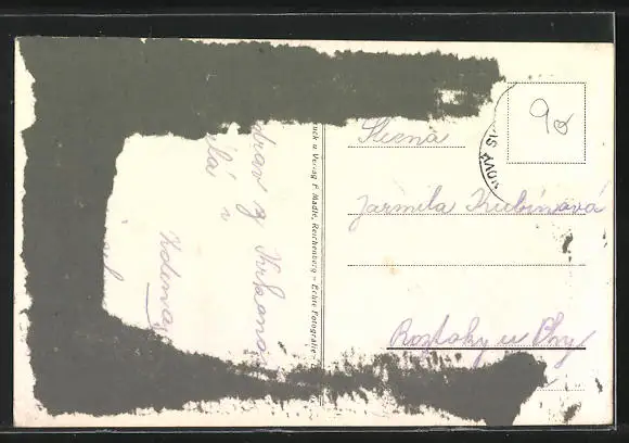 Personenbezogene Daten auf der Rückseite der Karte wurden durch blauen Textmarker unkenntlich gemacht. Die blauen Stellen sind auf die Vorderseite durchgeweicht und wirken sich negativ auf das Postkartenfoto aus