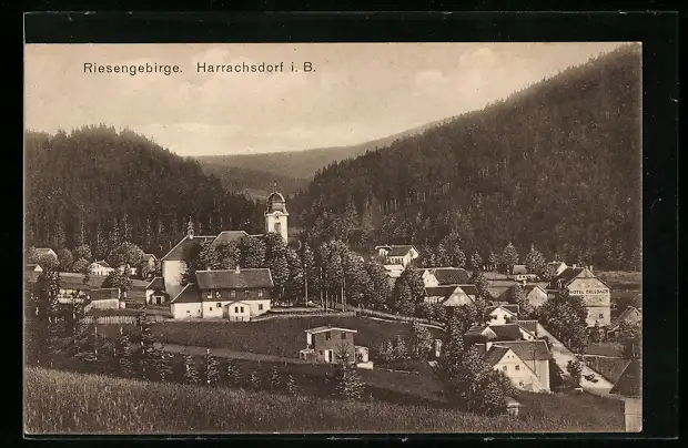 AK Harrachsdorf i. B., Ortsansicht mit Hotel Erlebach